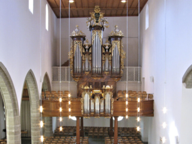 1962 wurde das vom damaligen Organisten Ernst Gerber initiierte und geplante Instrument durch die Orgelbaufirma Kuhn AG hinten im Westen der Kirche auf der Empore eingebaut. Ihr schlanker wunderbar abgerundeter Ton und ihr transparentes Plenum passen akustisch ideal in die Raumproportionen der Stadtkirche. Sie umfasst insgesamt 4493 Zinn- und 192 Holzpfeifen, und verfügt über 61 klingende Register, vier Manuale und ein Pedal.